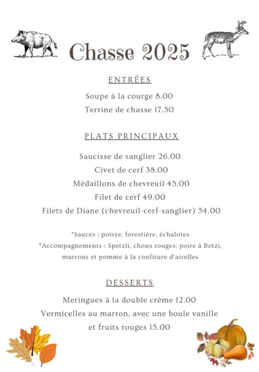 Venez savourer les saveurs authentiques de l’automne à travers notre menu de chasse 2025.